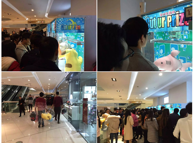 節(jié)日的商場里面,剪刀禮品機(jī)旁邊圍滿了顧客,玩的好嗨!