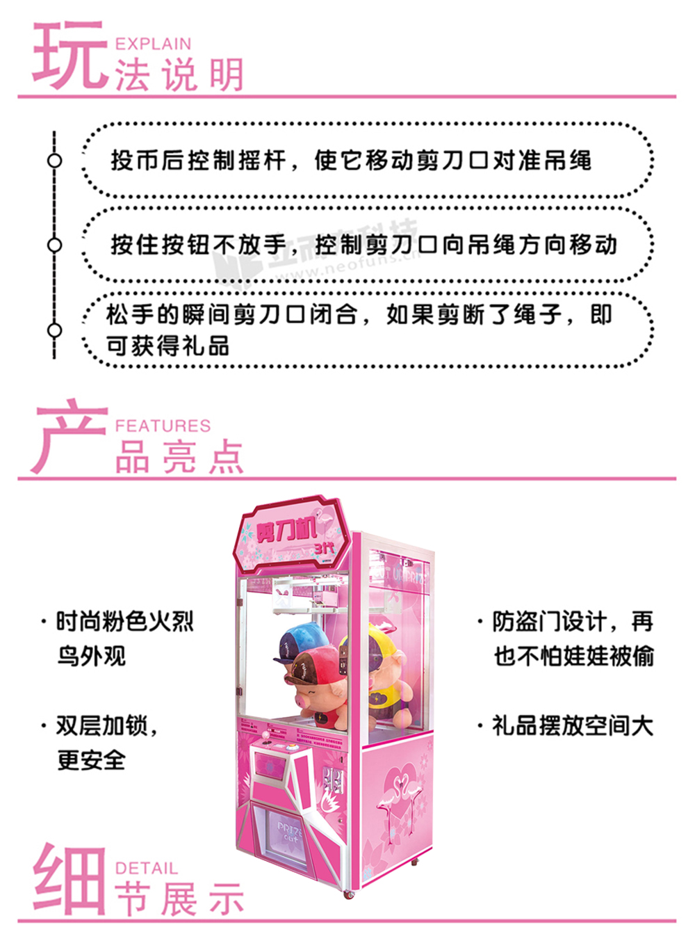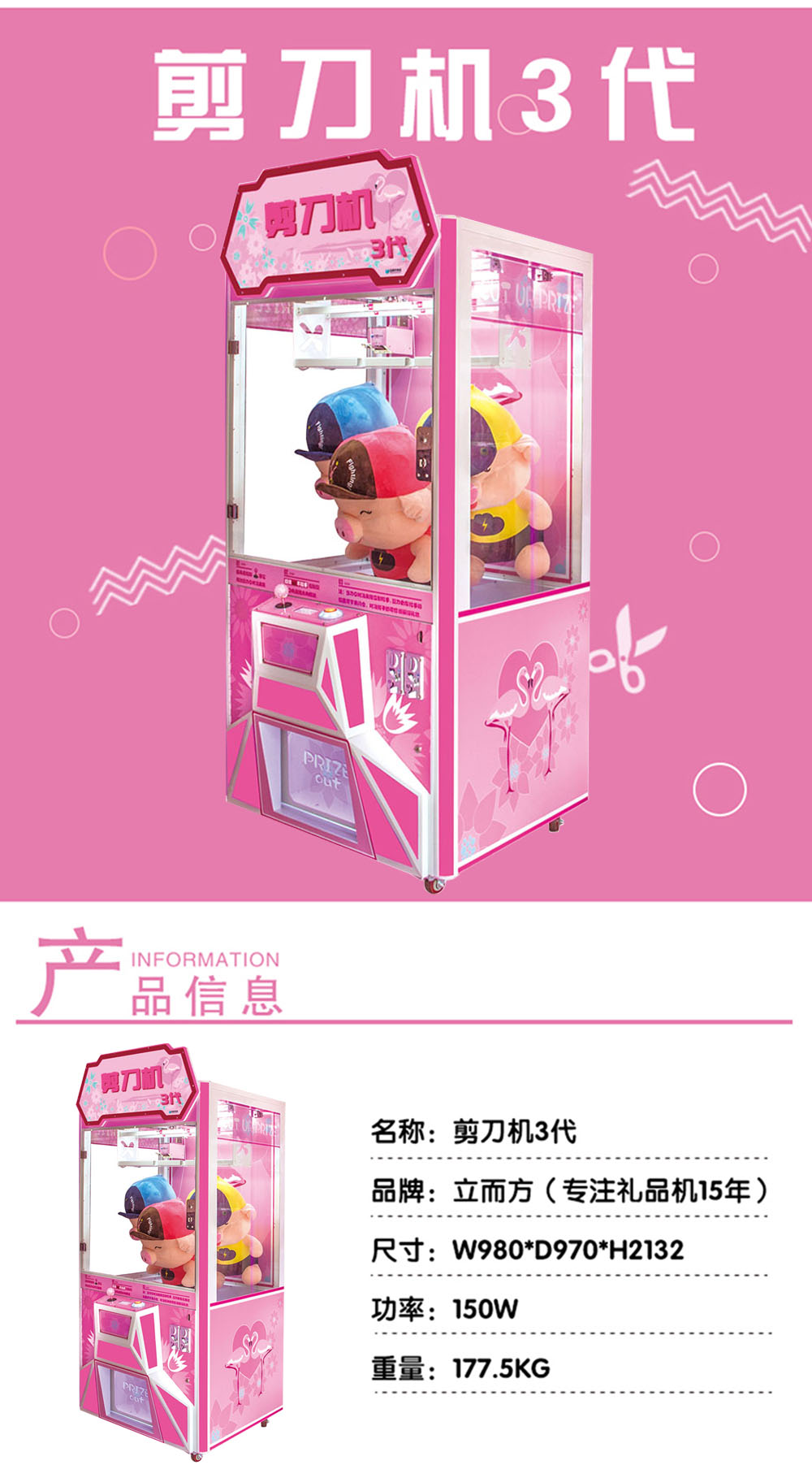立而方剪刀機(jī)三代是立而方自主研發(fā)的一款?yuàn)蕵?lè)、休閑的游戲機(jī),游戲操作簡(jiǎn)單,玩法有趣,適合各年齡段的人娛樂(lè)。由于這款禮品機(jī)在運(yùn)營(yíng)的過(guò)程中表現(xiàn)優(yōu)秀,從體驗(yàn)以及收益等多方面廣受好評(píng),也被玩家稱為“剪刀機(jī)”“剪娃娃機(jī)”。剪刀機(jī)采用以粉紅色為主的風(fēng)格,配上可愛(ài)的火烈鳥(niǎo)外觀,展現(xiàn)出一種高檔可愛(ài),喜氣美觀的感覺(jué)。經(jīng)過(guò)長(zhǎng)時(shí)間的市場(chǎng)反饋以及研發(fā)團(tuán)隊(duì)的不斷改進(jìn),剪刀機(jī)三代目前能夠很好的適應(yīng)大部分環(huán)境的場(chǎng)地。自主研發(fā)的的天車,配上穩(wěn)定的程序,更有超酷流行音樂(lè)氛圍,給玩家?guī)?lái)不一樣的娛樂(lè)體驗(yàn)。