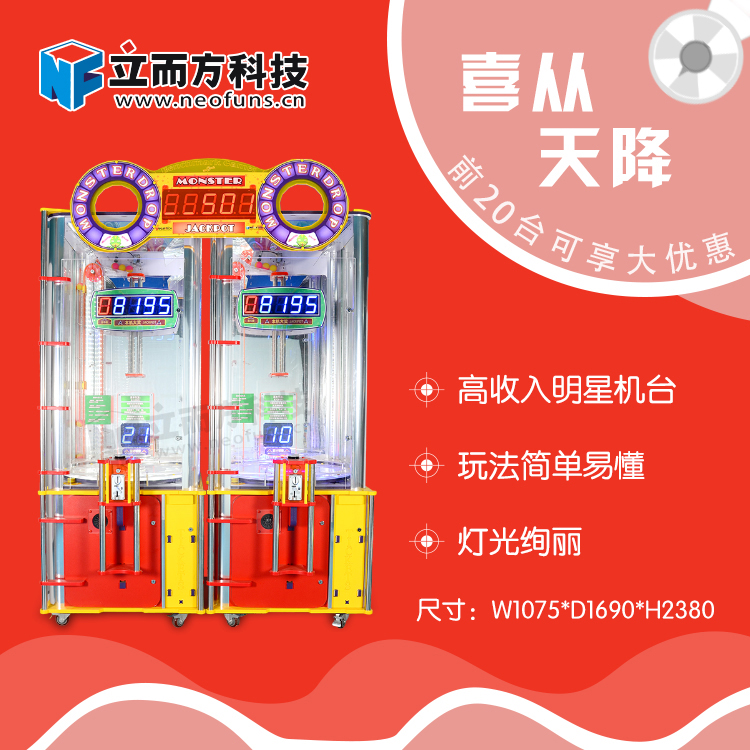 喜從天降,史上最快捷游戲,日收幣量高達(dá)3000幣的明星機(jī)臺(tái),喜從天降由立而方自主研發(fā)自主生產(chǎn)的一款?yuàn)蕵?lè)型彩票機(jī)。喜從天降超酷流行音樂(lè)氛圍,簡(jiǎn)單奢華的外觀設(shè)計(jì),符合當(dāng)代年輕人的個(gè)性追求。喜從天降游戲玩法簡(jiǎn)單,老少皆宜,按鈕控制掉球時(shí)間,球落入轉(zhuǎn)盤(pán)即可獲得相應(yīng)彩票,還有神秘JP大獎(jiǎng)!喜從天降的計(jì)分屏由數(shù)碼管和有機(jī)板組成,有機(jī)板具有良好的電絕緣性、高頻絕緣性尤佳,有一定的抗沖擊性、耐候性和耐老化性,透光性好等特點(diǎn)。喜從天降的轉(zhuǎn)盤(pán)可調(diào)4種轉(zhuǎn)速,孔位數(shù)一共有18個(gè),對(duì)應(yīng)18種不同積分或獎(jiǎng)勵(lì)。喜從天降的機(jī)箱由亞克力、不銹鋼、ABS和中纖板構(gòu)成,簡(jiǎn)潔美觀大氣,具有良好的防潮功能。